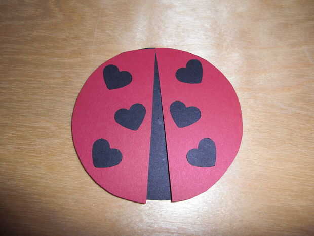 Añadir una almohadilla de espuma adhesiva a la parte inferior de cada pieza roja, luego use un palillo del pegamento para unir la mitad superior de la pieza roja al gran círculo negro como se muestra.
