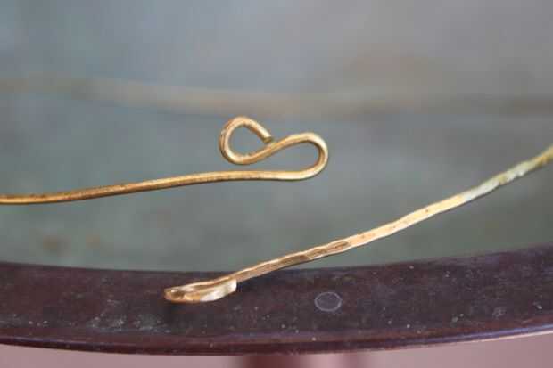 Ahora el cable cómodamente alrededor de su cuello, marcar y cortar. Los extremos de la arena. Doble puntas de alambre en los lazos que formarán un corchete que se enclavija.