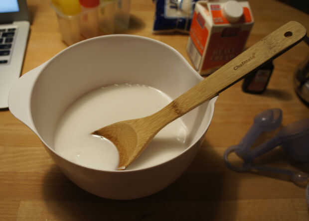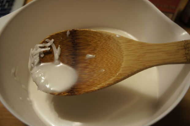 En la estufa, traer la leche de coco a fuego lento lento. Añadir el azúcar y revolver ocasionalmente hasta que el azúcar se haya derretido en la leche. Retire del fuego y vierta en un recipiente grande, preferiblemente uno que sea fácil verter desde luego. Añadir algo de hielo para enfriar la leche de coco. Cuando el hielo se haya derretido, añadir la leche, crema de leche, vainilla y coco escamas. Empecé con la adición de alrededor de 1/2 taza de copos de coco pero mantuvo agregando más hasta yo podría han añadido sobre una taza. Sentí que era bastante cuando lo dio un revuelo y estaba claro que había copos de coco.