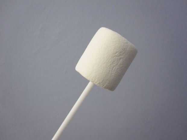 1. suavemente inserte un palillo de paleta en el lado de cada malvavisco. El palo debe parar en el centro o hasta su establo de lo marshmallow y no perforar por el otro lado.