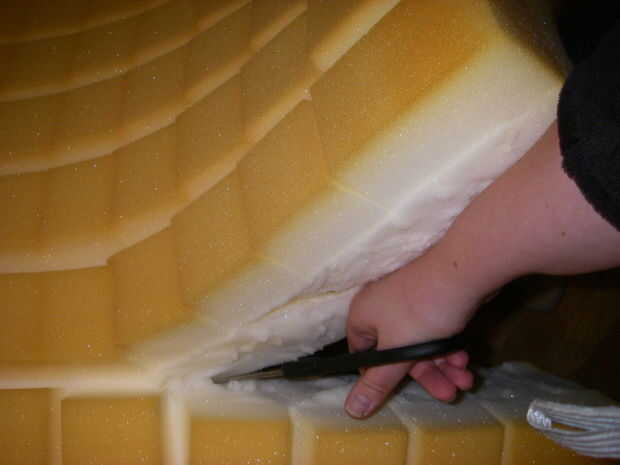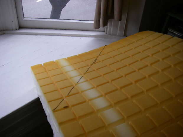 Tome la cubierta de su colchón para exponer la base de la espuma. Colchones Sultan de IKEA tienen una cuadrícula de anotó en la parte superior de la espuma. Esto resulta ser una fantástica guía para el primer corte. Hay una serie de implementos que puede utilizar para cortar (un cuchillo eléctrico, Sierra, etc.) pero me fui con mis tijeras de cocina fuerte confianza. Usted notará salió bastante desigual--mira para algo mejor que cortar si eres un perfeccionista/presionado por vez.