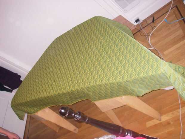 tengo tres yardas de tela, que era apenas suficiente. Les recomiendo que compren por lo menos una yarda más de lo que piensas que necesitas. Coloque a la tela sobre el cojín y asegúrese de que su recto. Remeter bien las esquinas (esquinas de hospital!) y poner un par de grapas en cada esquina. Luego engrape el medio de cada lado, manteniendo la tela ajustado (realmente apretado, no hacerlo lo suficientemente bien!). Comprobar para asegurarse de que está mirando bien, luego engrape alrededor el resto del cojín. Si quieres ser elegante puede el tejido debajo del doblez en el borde y luego engrape.