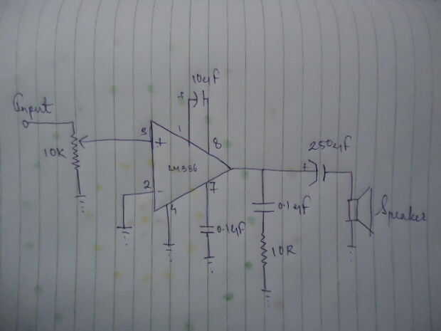 Este es un diseño simple, en este arreglo el amplificador da una ganancia de 200.The está actuando como un amplificador no invertir dando salida de audio es sobre 2-3watts. El volumen puede ajustarse por el pote de 10 k. La ganancia también se puede ajustar mediante la adición de un pote del 10 k en serie con el casquillo de the10uf entre el pin 1 y 8.