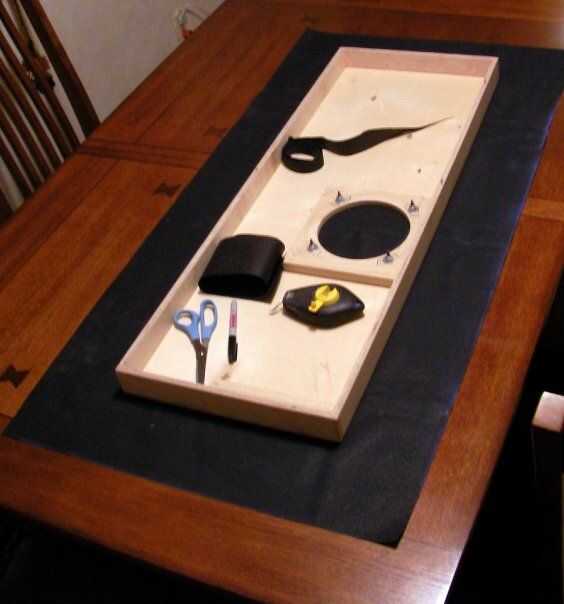 Mi amigo y yo terminó gastando alrededor de $100 en el proyecto, para la madera contrachapada, cemento de contacto, Tolex, terciopelo, adhesivo en aerosol, espuma y hardware. Había terminado en el transcurso de 3 o más meses, trabajando cuando podía los fines de semana y algunas noches de semana. Para construir el cuadro usé mi Hanon, router, pistola de grapas neumáticas, lijadora orbital y unas pinzas. Para el Tolex y el interior utilicé una navaja de borde recto y cuchillo de pan (a forma de la almohadilla de espuma), así como un par de pinceles de espuma para aplicar el cemento de contacto.