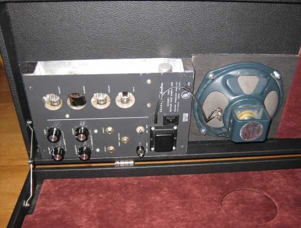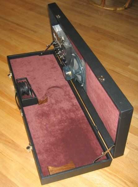 Construí el caso de madera contrachapada de abedul Báltico y había cubierto con Tolex negro (vinilo de tela reforzada) y había forrado el interior con terciopelo rojo. También hice mi caso un poco más que la original por lo que podría colocar un altavoz de imán de Alnico en lugar del altavoz del imán de cerámica original, menos eficiente. El orador de recambio es un vintage Jensen que rescatado de la acera cuando un negocio local lanzó todos sus viejos altavoces de Muzak. Con la profundidad de caja extra también hizo un doble fondo para guardar cables y tal e incluye un pequeño compartimiento Tolex cubiertas y revestimiento de terciopelo para micrófono de armónica y pedal de mi amigo.