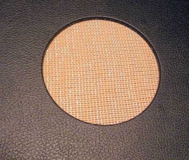 El otro reto interesante fue el recorte de la rejilla del altavoz. Yo quería un agujero redondo y no tenía idea de cómo iba a terminar, pero terminé pudiendo calor el tolex y stetch lo suficiente para poder envolver completamente el agujero del altavoz. Las imágenes dan una idea bastante buena de cómo corté el Tolex para este paso. Cuando el pegamento estaba listo, calienta el Tolex con un sistema de pistola de calor pequeño bajo y lentamente lo trabajado alrededor del borde del caso, estirando suavemente y el Tolex en el interior de la caja de embalaje. Para el paño de la parrilla que utiliza una pieza que rescatado de la caja original y que montado directamente al altavoz montaje tablero usando cemento de contacto. Estaba realmente contento con la buena mirada limpia de la parrilla.