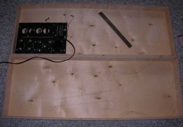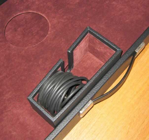 Para el fondo de la caja pegué 3/4 "x 3/4" tiras de álamo (pintado de negro) a lo largo del interior perímetro de la caja y añadir otra tira cerca de la mitad para apoyar el fondo falso y la parte inferior se dividen en 2 compartimientos. Usé pegamento de construcción Liquid Nails para esto. Entonces hice la caja mic y pedal totalmente equipadas cuidadosamente el caso para que no interfiriera con el ajuste de la guitarra. Después de marcar la posición de la caja, cortar el terciopelo para el inferior, luego usa el adhesivo en aerosol de 3 M para pegar el forro en su lugar. Deja la madera debajo de la caja del micrófono y el interruptor de pie desnudo y había pegado a la caja en su lugar usando adhesivo de construcción Liquid Nails. Montar el caso con nuevas bisagras, cierres, estancias de la tapa y cromo pies (para proteger la parte inferior de la caja) y fue capaz de volver a utilizar la palanca de la caja original.