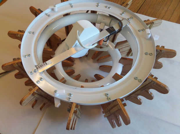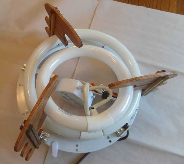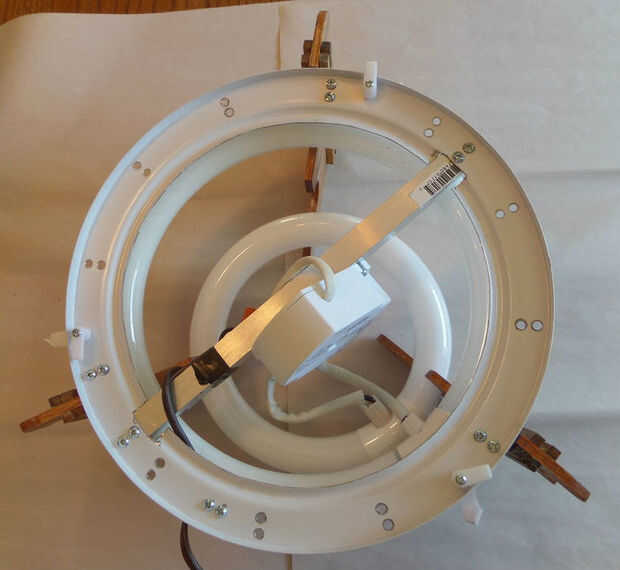 Ahora gire cuidadosamente el conjunto de la lámpara del lado derecho para arriba con el metal base en la parte superior. Instale el resto de los portalámparas. Ajustar el ángulo para que cada uno apunta a través de a uno en el otro lado y todo se ve aún. Asegúrese de instalación los titulares que las bombillas no están en un aprieto y los conectores del bulbo están alineados con el cable de alimentación. Dejar el dedo de tornillos firmemente en este punto