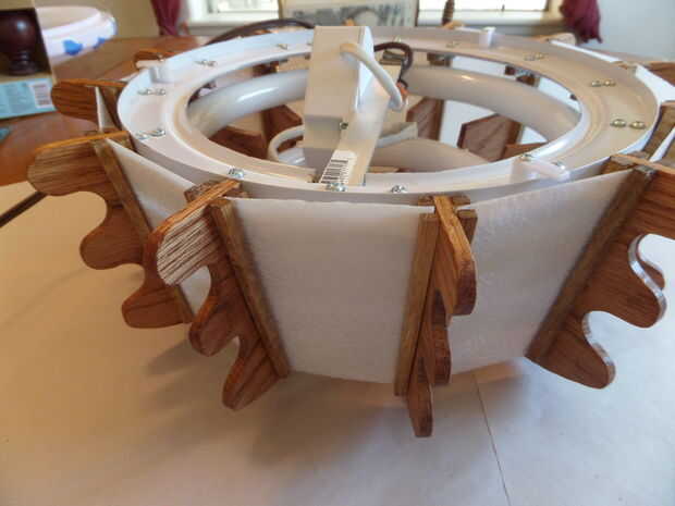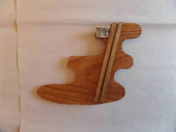 Utilice dos tornillos 8-32 y tuercas y pernos de la ménsula angular de a sostenedor de la lámpara. El soporte de los pernos en el lado derecho del sostenedor de la lámpara. Ver imagen #2 que los tornillos pasan por el soporte de metal con las tuercas en el lado de la madera.