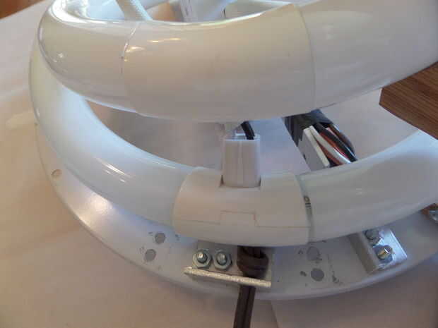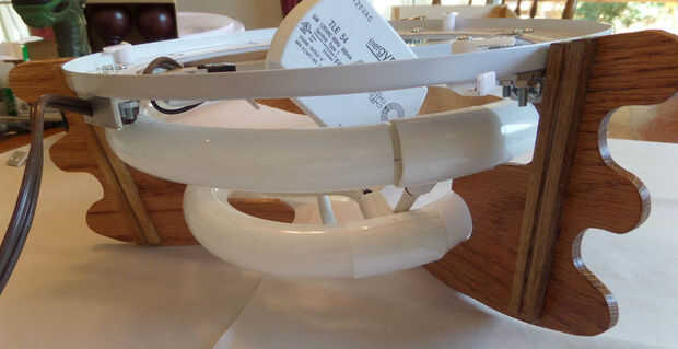Coloque el updside base de lámpara de metal hacia abajo. Ver Figura #1 arriba. Perno de un sostenedor de la lámpara a la lámpara de metal base con los tornillos pasando por el metal base de la lámpara y las tuercas del lado del sostenedor de la lámpara. No apriete los tornillos hasta el final, se ajuste a medida que avanzamos. Hacerlos a mano. Colocar dos lámparas en la Asamblea y para el primer sostenedor de la lámpara con cinta adhesiva. (De esa manera usted no cae como lo hice :) Enchufe las lámparas para el lastre. Asegúrese de que el conector de 32W se une a la bombilla de la lámpara de pie grande. Oriente los conectores de la bombilla para que estén sobre el soporte del cable de extensión. Coloque el segundo sostenedor de la lámpara 1/3 de la manera alrededor, el tercer soporte 2/3 de la manera alrededor. Captará las lámparas para que usted no tendrá que preocuparse de caer las lámparas. Retire la cinta.