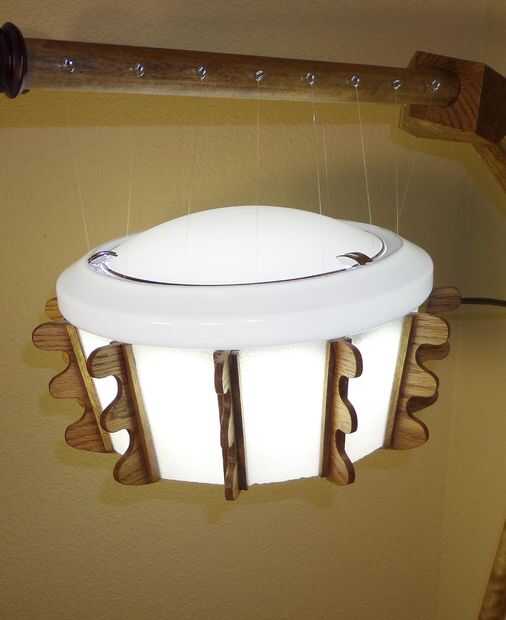 Coloque el ensamblaje de la lámpara bajo el soporte de la lámpara a la altura correcta con el cable hacia la parte posterior. Usé una tabla y apilados para arriba algo de madera para llegar a 42", la parte inferior de la Asamblea de la lámpara. Centro bajo el soporte de la lámpara. Utilice un nivel y utilice cuñas si es necesario.