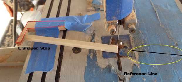 Punta: En la Sierra de banda puse un trozo de cinta azul y dibujó una línea en 15 grados. Grabado un pedazo de chatarra en forma de "L" como una parada. Ver cuadro #5