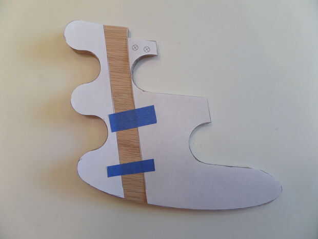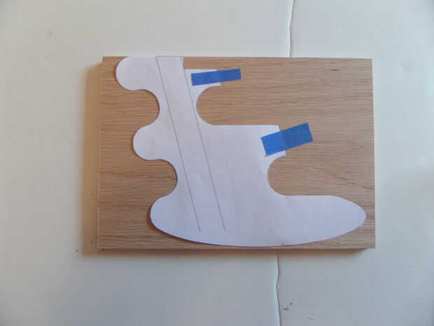 Printthe lámpara soporte plantilla pdf archivo y uso de las tijeras para recortar el contorno de la forma. Imprimir en tamaño real (100%). Hay una barra de 3" de verificación, asegúrese de que el tamaño de la plantilla es correcta. No corte las dos líneas diagonales punteadas o la línea de guiones corta al lado de los agujeros, utilizaremos ésos más adelante. Cinta el corte hacia fuera de forma en el borde superior de la chapa de madera de roble de 1/4" como se muestra. Don'tcover los dos agujeros en el papel. Traza la forma. Utilice sus dedos para sostener el papel donde están rastreando. Utilizar un clavo o un punzón para hielo y marque el centro de los dos orificios. Sólo una ligera indentación para que sepamos dónde perforar un agujero más adelante. Levante el papel y marca Dónde está la línea punteada pequeña al lado de los agujeros. Retire el papel. No te preocupes el hueco donde estaba la cinta. Utilice un borde recto para llenar el espacio en blanco.