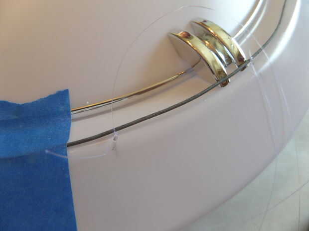 Para mantener la línea de tirar a través, corté un trozo de alambre de imagen tiempo suficiente para ir todo el camino alrededor de la circunferencia del agujero taladro diámetro. Temporalmente el anillo del alambre de la imagen a la parte superior de la pantalla de la cinta y atar un trozo de hilo de pescar en cada agujero. Un doble nudo alrededor de cada pieza.