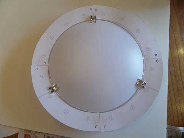 Cortar las piezas de plantilla de cortina de lámpara plástica. 4 piezas se pegará junto para formar una plantilla. Únalos con cinta adhesiva las dos piezas con una "A". Deslice las dos piezas debajo de las barras de cromo doble (que pueda deslizarse por debajo). Centro de la costura en las barras de cromo doble. Las otras piezas de la cinta (B-B, C-C, D-D. El doble de líneas debe estar centrado en las barras de cromo doble. La plantilla completa a la cortina de lámpara plástica para mantener en su lugar con cinta adhesiva.