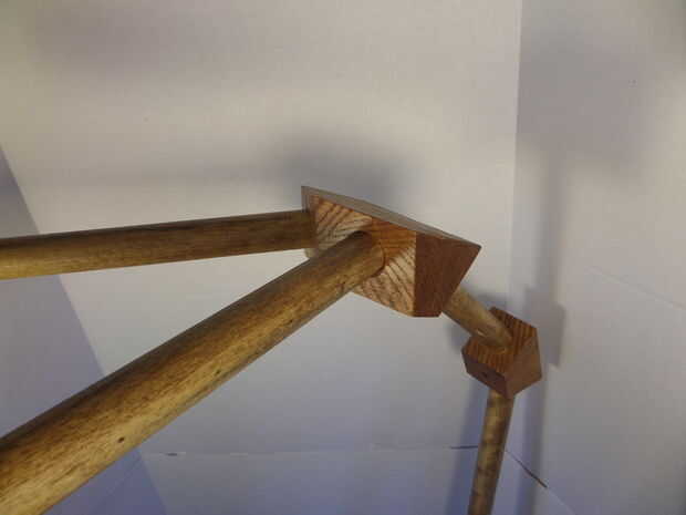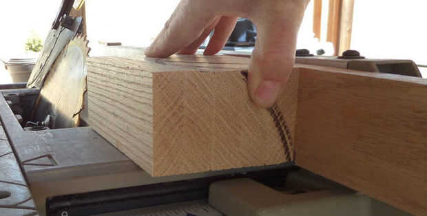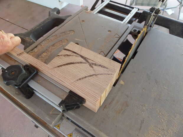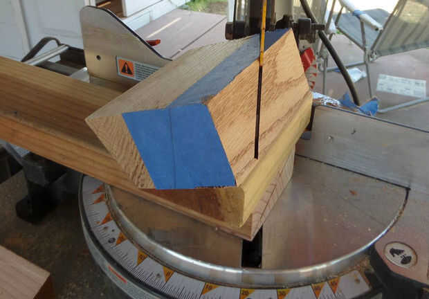 Cortar 5 piezas de 6" de largo de lo 3/4" x 2 1/2" roble. Pegamento y fije las piezas a la población restante como en el último paso para hacer 6 piezas con un mango largo. Deje transcurrir 24 horas para el pegamento se seque. Cuando el pegamento seca hace limpiar cortes y un grado de 22 1/2 corte como se muestra en el cuadro #4. Tenga cuidado con los cortes de limpieza para no cortar más allá de la parte en el mango. El mango largo se puede cortar ahora.