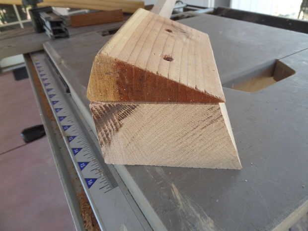 Marque la línea central de la parte. Los dos cortes se reúnen en el centro. Si tienes una ingleteadora Sierra, hacer un compuesto 22 1/2 y 22 1/2 grado cortar como se muestra en el cuadro #4. Si no tienes una ingletadora, corte un pedazo de 2 x 4 22 1/2 grados y atorníllelo a la parte inferior como se muestra en el cuadro #5. En cualquier caso, atornille una pieza larga de 2 x 4 en la parte inferior para hacer una manija. Haga el grado 22 1/2 como se muestra en el cuadro #6. Girar la parte y hacer el corte del segundo 22 1/2 de ese lado.