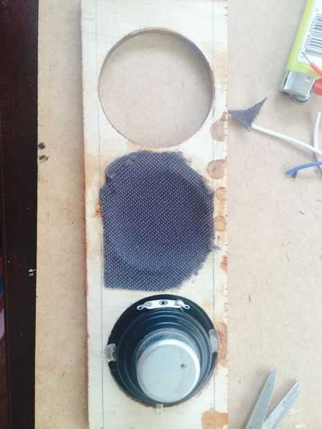 He utilizado un trozo de tela del altavoz que arrancó de una vieja parrilla del altavoz para cubrir los radiadores pasivos de Logitech. Asegúrese de que usted pegue altavoces donde los terminales será fácilmente accesibles para el cableado más adelante. Tuve los terminales hacia dentro, que es cerca de mis dos amplificadores para los altavoces. Por lo tanto, los cables no tendría que ser tan largo.
