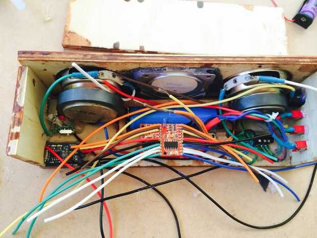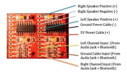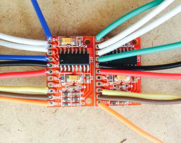 Un amplificador se le asignará a un panel del lado con altavoces, para que donde están sentados en relación con la bocina, escuchará ambos canales al mismo tiempo (estéreo). Cada cable es de unos 80 mm, que asegura que hay suficiente cable para llegar a los lugares apropiados (es decir, los cables de interruptores o de otros módulos), puede cortar exceso si es necesario.