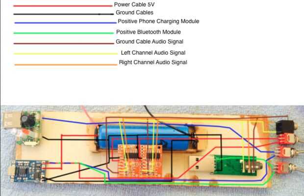 Nota: El cable rojo (con guiones azules y verdes), desde el módulo azul salida + terminal (módulo de carga de batería) es un alambre de longitud solo 50 mm, que luego conecta con el teléfono carga el módulo (cable azul) y el interruptor del módulo Bluetooth (cable verde).