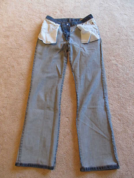 Gire los jeans sueltos adentro hacia fuera y los ponen sobre una superficie plana con el lado frontal hacia arriba. Asegúrese de que los pantalones son totalmente planos y que ninguna parte se está pegando para arriba. El pantalón debe parecerse a la imagen, con las piernas abiertas como necesidad para que puedan poner el plano.