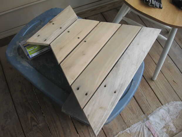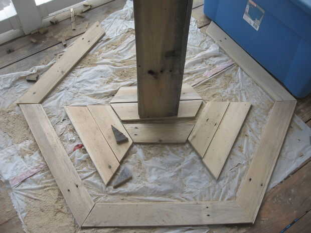 Utilizamos tornillos de cabeza phillips al aire libre para montar la mesa. En primer lugar, hemos reunido las tres secciones de apoyo de la mesa como se ve en la primera figura. Éstos fueron unidos al pilar central, y el resto de la mesa fue suspendido entre estas tres secciones de apoyo. No podríamos apoyar los seis lados como los plantadores interrumpía cualquier ayudas va desde el pilar central en aquellos lados donde residen. Dos de los corredores de una plataforma se cruzaron en un patrón de 'X' para ser utilizado como las piernas y atado en la parte inferior del soporte central.