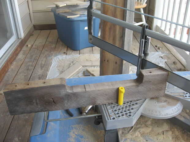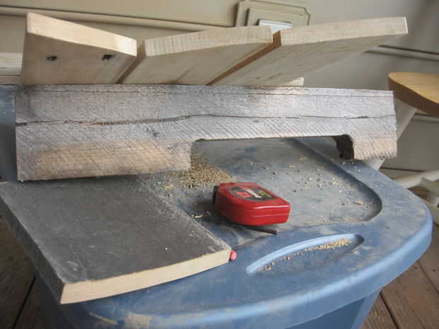 Después de haber desmontado los palets, luego fue tiempo para cortar nuestros componentes y ensamblarlos. Utilizamos una caja de ingletes para conseguir los numerosos ángulos de 60 grados necesarios para esta mesa hexagonal. Una vez que se cortaron las piezas, utilizamos una lijadora eléctrica para hacer ambos áspero (grano 80) y fino (grano 200) lijado.