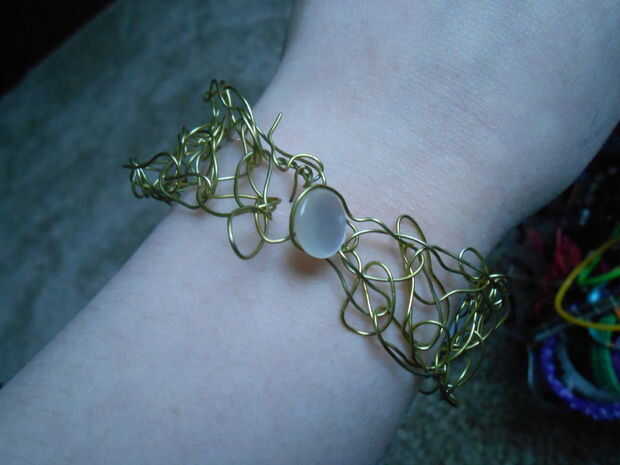 Esta pulsera consiste en tres círculos que han sido ganchillo juntos. Utiliza el mismo principio utilizado para tejer de mobius, pero normalmente siete anillos se unen de esta manera tejiendo unos en los otros una vez. Para esta pulsera, tejió los cí
