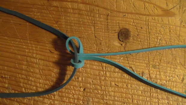 Para hacer el nudo, simplemente con mirar la imagen. Poner fin de una banda de goma en otra banda de goma y el otro extremo fuera de ella. Jalar el extremo que está hacia fuera a través del que se encuentra en. Tire para apretar.