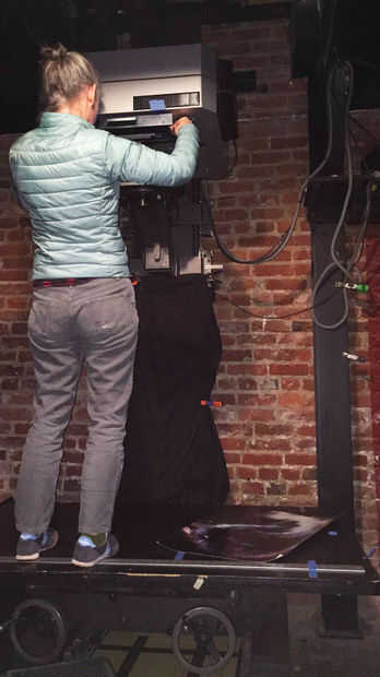 Aquí está un diagrama de un amplificador típico de 35mm, luego con una foto y me carga el portador negativo en una ampliadora de color de gran formato (8 "x 10"). Aunque el tamaño es muy diferente, la idea básica es la misma. De arriba a abajo te tienen: una luz / casa de lámpara > portador negativo > lentes > espacio para la luz viajar > plano donde poner su papel para la exposición / caballete. El espacio entre la cabeza de la ampliadora y el caballete (y el tamaño de la lente usada) decide la cantidad de aumento. La cantidad de espacio entre la lente y el portador negativo ajusta el foco. La principal diferencia entre estos dos ampliadoras es tamaño, que permite hacer una impresión de una negativa más grande y también permite hacer una impresión más grande.