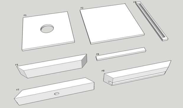 Parte #4 son los rieles que se utilizan para ajustar el tamaño de la cabeza de la ampliadora. Mina son rectángulos de 24 cm x 2 cm cortadas de madera contrachapada con un recorte amplio de 1 cm en el centro que comienza 1 cm el borde superior e inferior. El ancho de la abertura debe ser lo suficientemente grande para sus pernos hexagonales caber libremente. He encontrado la longitud (24cm) a la broca un poco más de lo que necesito pero no duele nada.