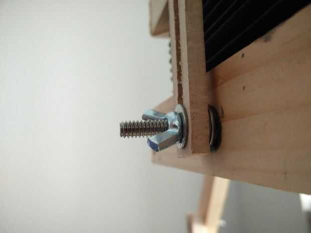Cuando todo se seca hacia fuera, puede montar los rieles y las tuercas de mariposa. He encontrado que necesito utilizar 3 arandelas total (2 interior, 1 exterior) porque la broca roscada del perno era demasiado corta de otra manera. Si tienes diferentes pernos, usted puede conseguir lejos con menos arandelas.