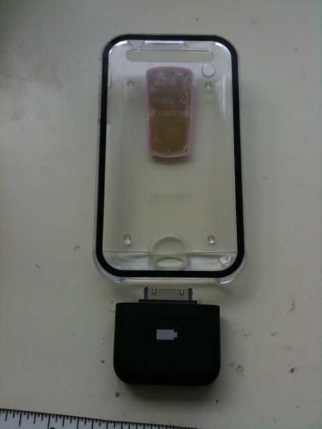 Esta foto muestra el caso sí mismo (la cosa rosa en la parte posterior es una palo-linterna LCD) y el cargador. El cargador es demasiado grande para caber a través de la parte inferior, lo que hace imposible cargar el iPhone en el caso.