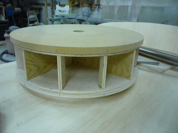 hice una base de madera contrachapada y remata con MDF de 3/4". Los lados estaban cubiertos de 3/8" espesor snakeply (meneo madera, flexply, tiene muchos nombres) la película que fue sujetado con grapa a las costillas de madera contrachapada. Llena las grietas y grapa marca con spot putty y utiliza un enrutador para radio del borde superior. El agujero en la parte superior es de un 2" poste de acero inoxidable que se sujeta el lápiz vertical.