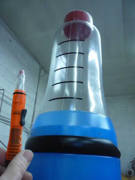 El depósito claro es una sección sin pintar del policarbonato formado aspirado. La pieza roja en la parte superior vuelve a SignFoam3 preparado y pintados de rojo. Mayoría de las veces la pluma se mostrará con la tapa en pero el depósito puede verse todavía a través del azul translúcido.