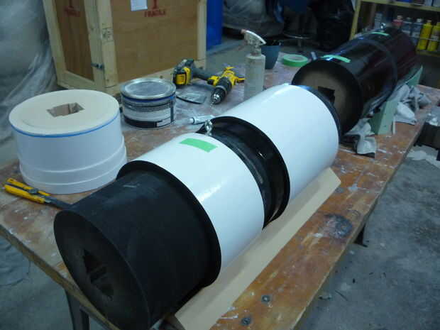 Pegan las mitades y rechazado en el torno para hacer las tripas de la pluma. Entonces les cubrió con vinilo blanco y negro.