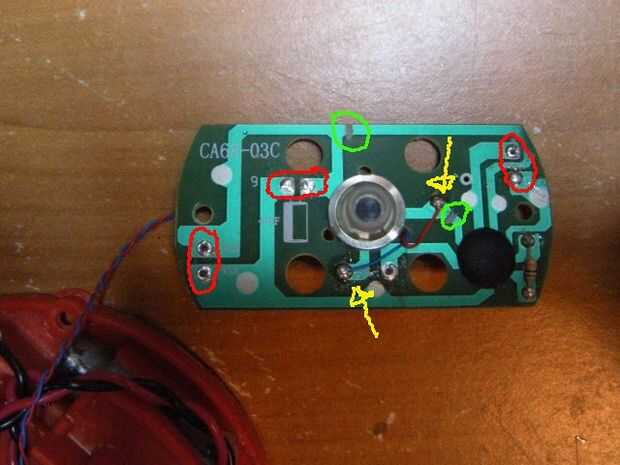 Finalmente, conecte los cables al pulsador en los puntos de prueba donde las flechas amarillas muestran. Pase los cables a través de uno de los orificios al lado del botón.