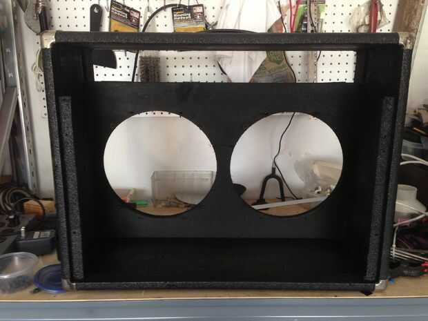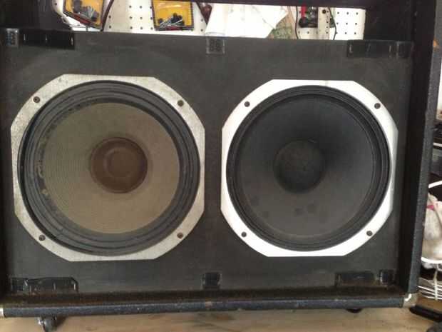 Quitar la tapa superior trasera donde habría sido el amplificador y la inferior. Y quitó las ruedas de mierda que estaban en él. Eran cerca de 1 1/2 pulgada y pegado en todo. La golpeó con la aspiradora de taller y y luego agua tibia y un paño de cocina. No tratando de hacer que se vea perfecto, sólo quitar el polvo más importante y la maldad. Esto probablemente sentado en un armario de almacenamiento para mucho tiempo. Aviso que no se adaptan perfectamente a los altavoces. Esto significa que uno fue reemplazado en algún momento.