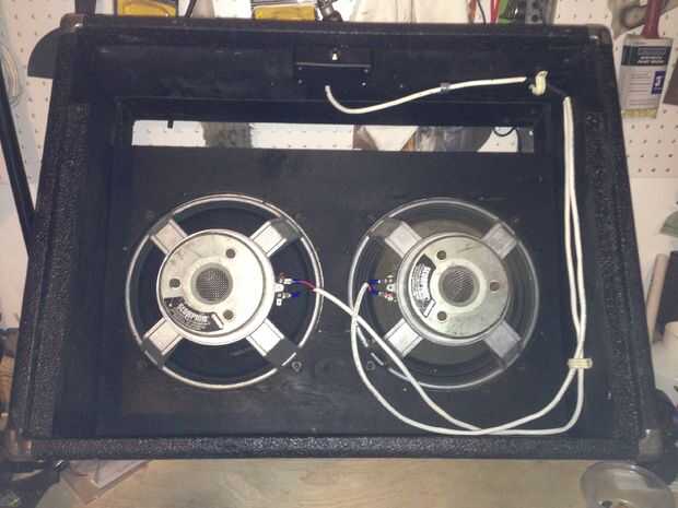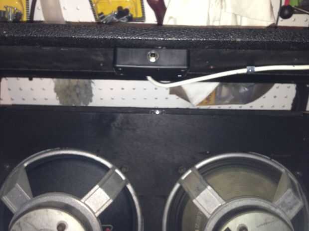Ahora que se repara el altavoz y la cáscara limpia, tiempo para volver juntos. Utilicé parte de mi prueba del arnés de cableado que iwas ya cableados en paralelo, y los terminales de altavoz fueron en él. He utilizado una caja de sobrantes del proyecto de Radio Shack, perforó dos agujeros y poner un nuevo jack mono de 1/4 de pulgada y funcionó el alambre hacia fuera de un agujero en la parte posterior de la caja. La caja es caliente pegado y atornillado a la parte superior de la amp con algunos tornillos que encontré en la cáscara durante el desmontaje y limpieza. Usé algunos clips de alambre gestión tenía sobras de otro proyecto y atornillado directamente a la caja para mantener los cables fuera del camino y limpia. Yo pude han pintado la chaqueta de hilo negro, pero quería terminar y ROCK!