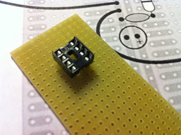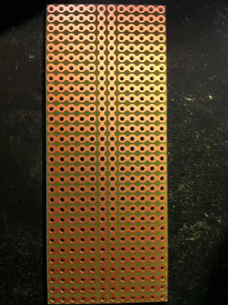 Primero y principal, la proto-board de Mouser era diferente que la Junta que se muestra en la revista hacer. Los rastros a los lados continuaron hasta el final. Así que tuve que mover los elementos para evitar que apenas pone en cortocircuito hacia fuera. La combinación del esquema y la imagen que he creado debe aclarar las cosas. (Espero).
