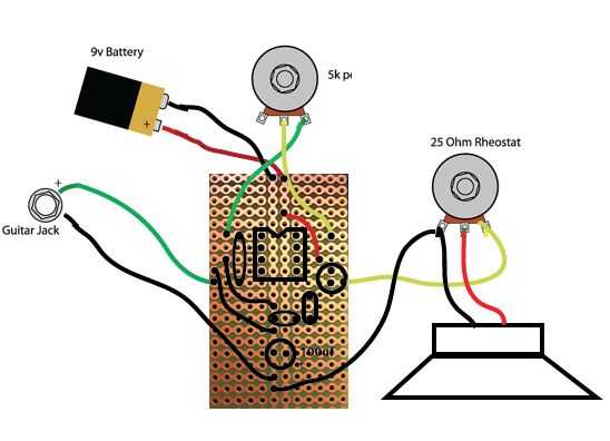 En este punto, usted puede decidir si desea utilizar el reóstato de 25 ohmios. Creo que es algo redundante. La guitarra tiene una perilla de volumen, el potenciómetro es una ganancia para el amplificador. Es su opción. Sólo puede saltar más allá de ella y conecte la salida del capacitor de 200uf para el altavoz. Voy a dejar por ahora, pero lo compré lo suficiente como para hacer otro, puedo saltarla la próxima vez. Si lo mantienes, te da más control.