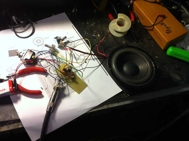 Todo cableado, puse algún poder a él conectado la guitarra y hace algo de ruido.