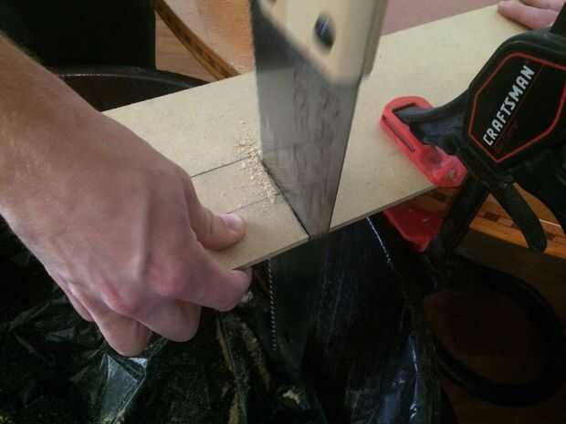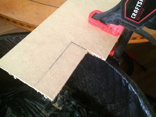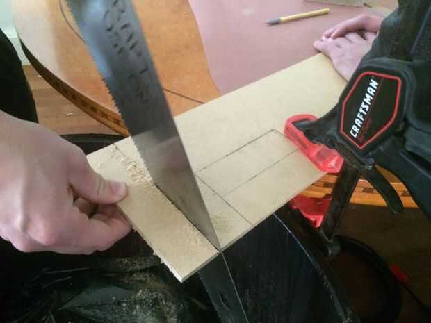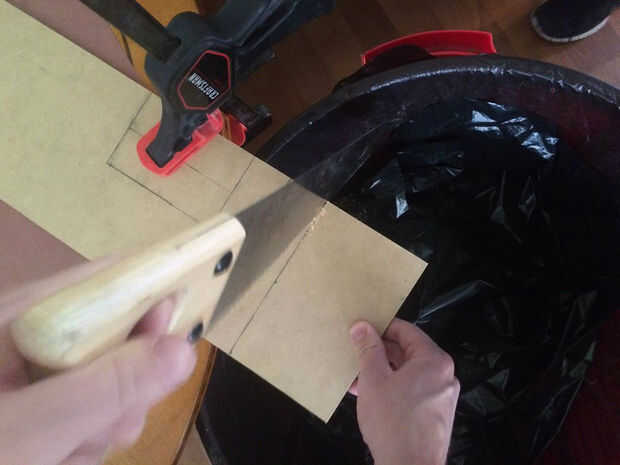Para el primer corte sierra y corte siguiendo la línea primero dibuja a retirar la pieza de 4 "x 6". Después de esto siga la línea para eliminar las piezas de 1,5 "x 6". Para eliminar las dos últimas piezas siguen la línea en el tablero como se muestra arriba. Una vez realizado el corte Retire el externo la mayoría pieza primero siguiendo la línea. A continuación la última pieza puede eliminarse cortando a lo largo de la última línea dibujada en el tablero.