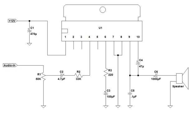 5. condensador C6 permite al amplificador ser usado con una fuente de alimentación balanceadas (+ 12V y GND). Normalmente la salida del IC se establece en 1/2 de la tensión de alimentación que no se puede conectar directamente al altavoz sin la quema y/o IC hacia fuera. C6 bloquea la salida de la C.C. de la IC y pasa el audio amplificado a los altavoces.
