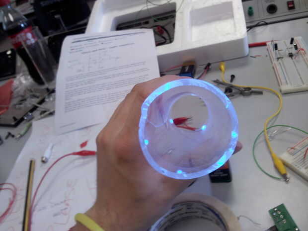 Para difundir las luces alrededor de los altavoces he utilizado barra de acrílico, perforado en un extremo de 5mm para aceptar los LEDs y arena en el otro con grano 400 mojada y seca para desactivar la luz. Los tubos bajos son tubo de acrílico perforado 5mm otra vez para aceptar los LEDs pero esta vez las lentes de los LEDs han sido arena lejos como quiera la luz difusa a través del lado del led y no sobresalir en el tubo.