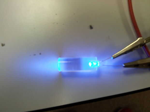 (tengo estos LEDs en serie y paralelo para probar pero básicamente son LED azul ultrabrillante, tienen un seguro voltagge de trabajo de hasta 5.5v 17/5.5 = 3.09 así puedo tener 3 LEDs en serie y un resistor protector.