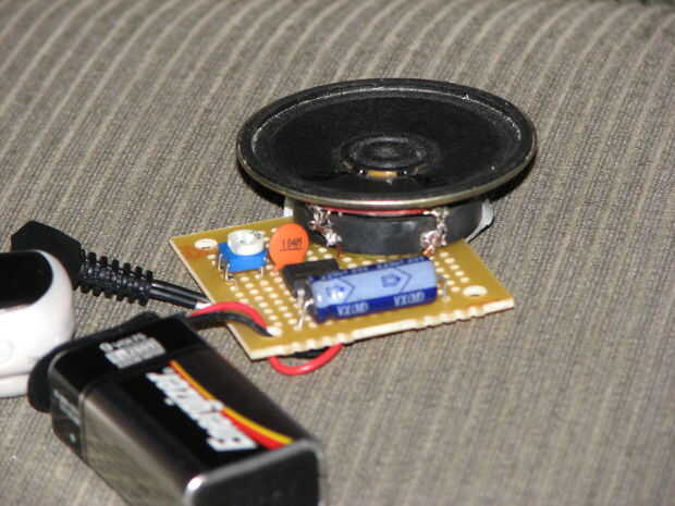 Compruebe todas las conexiones para cortocircuitos y conexiones en mal estado. Luego, una vez que todo esté en su lugar, probarlo. Para mejorar un poco el sonido, corte el fondo de un vaso de plástico y colóquelo sobre el altavoz.
