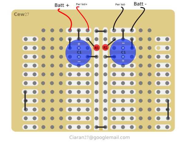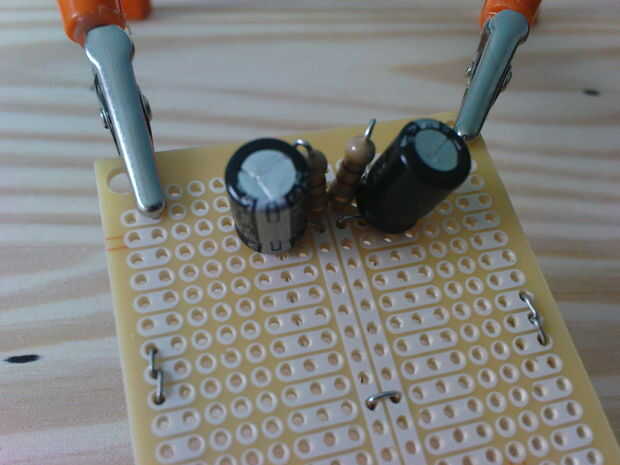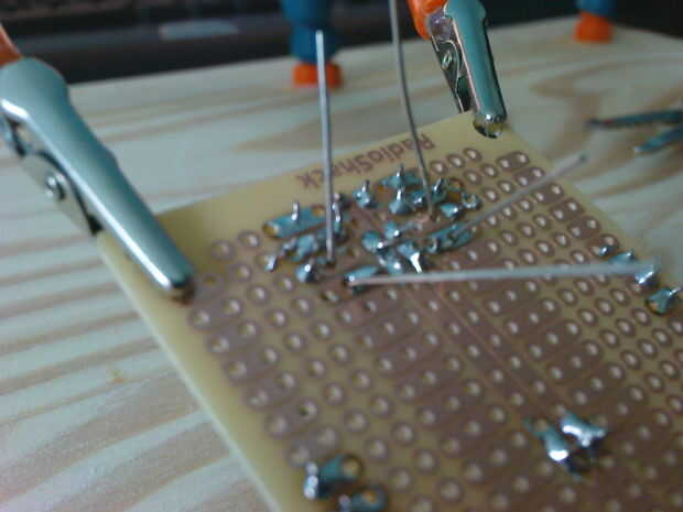 Cuando los componentes se ponen en allí agujeros doblar las piernas para ayudar a mantenerlos en su lugar hasta que el soldado, luego clip el exceso de las piernas.