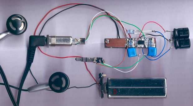 El interruptor on-off se ha colocado en el conector de la batería. Así que esta imagen muestra el amplificador de auriculares completo, así como los audífonos baratos que estoy usando para probar con.