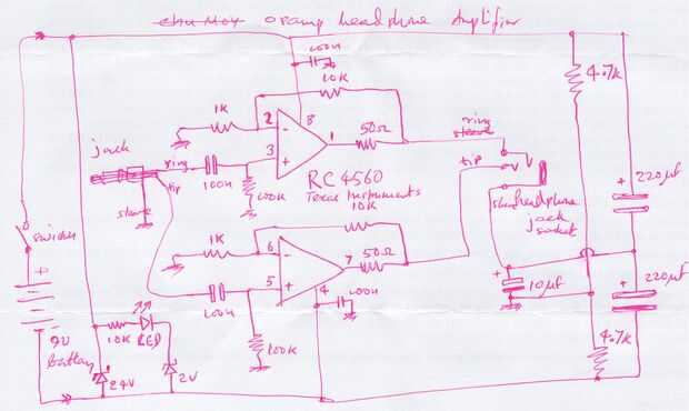 El amplificador original en el Chu Moy utiliza opamps entrada FET. Éste utiliza una versión mucho más barata bipolar. La tierra virtual, en la que se encuentra el terminal común de auriculares, es ahora flotante.